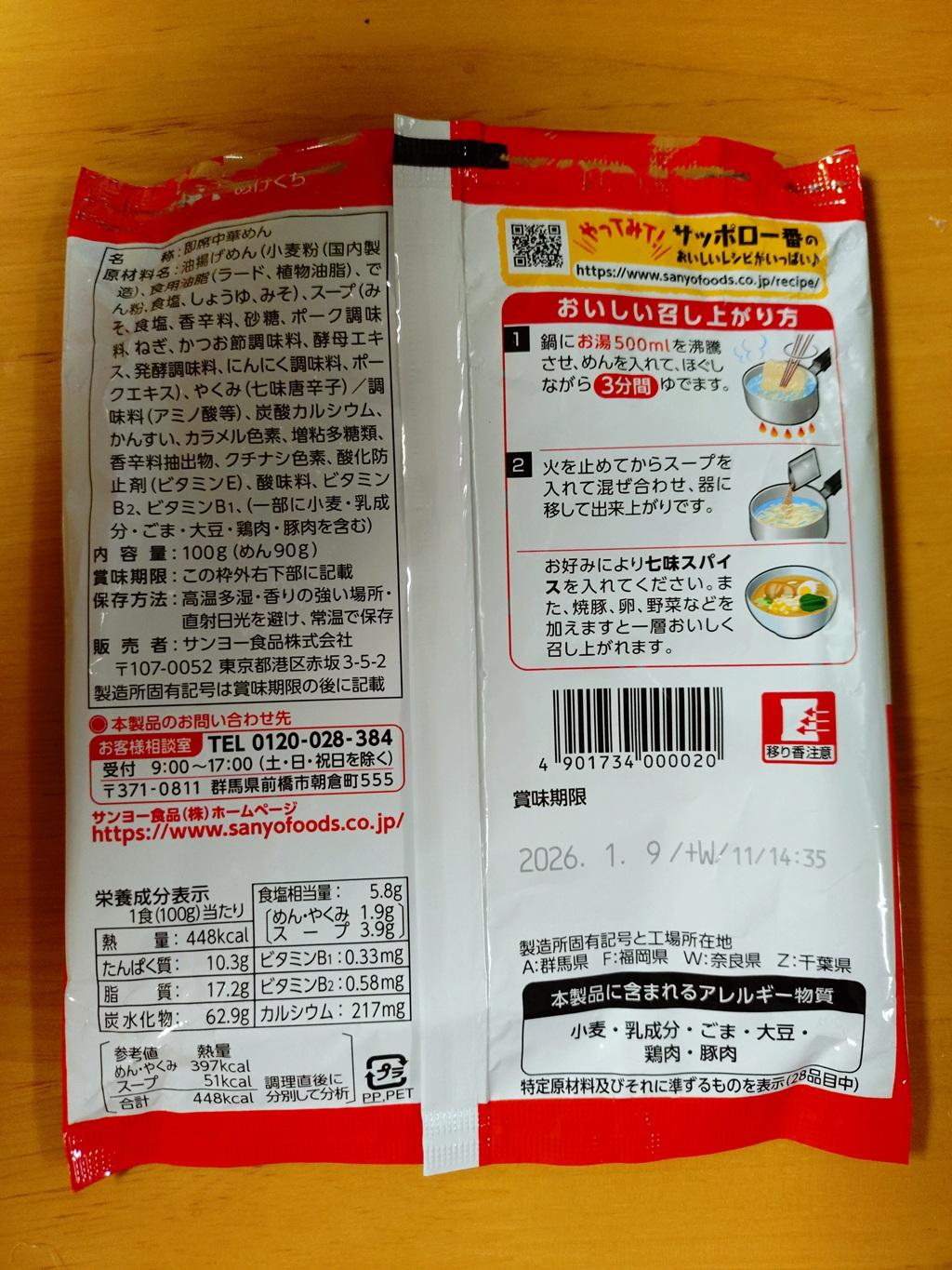 サッポロ一番(パッケージ裏側)に記載されている情報